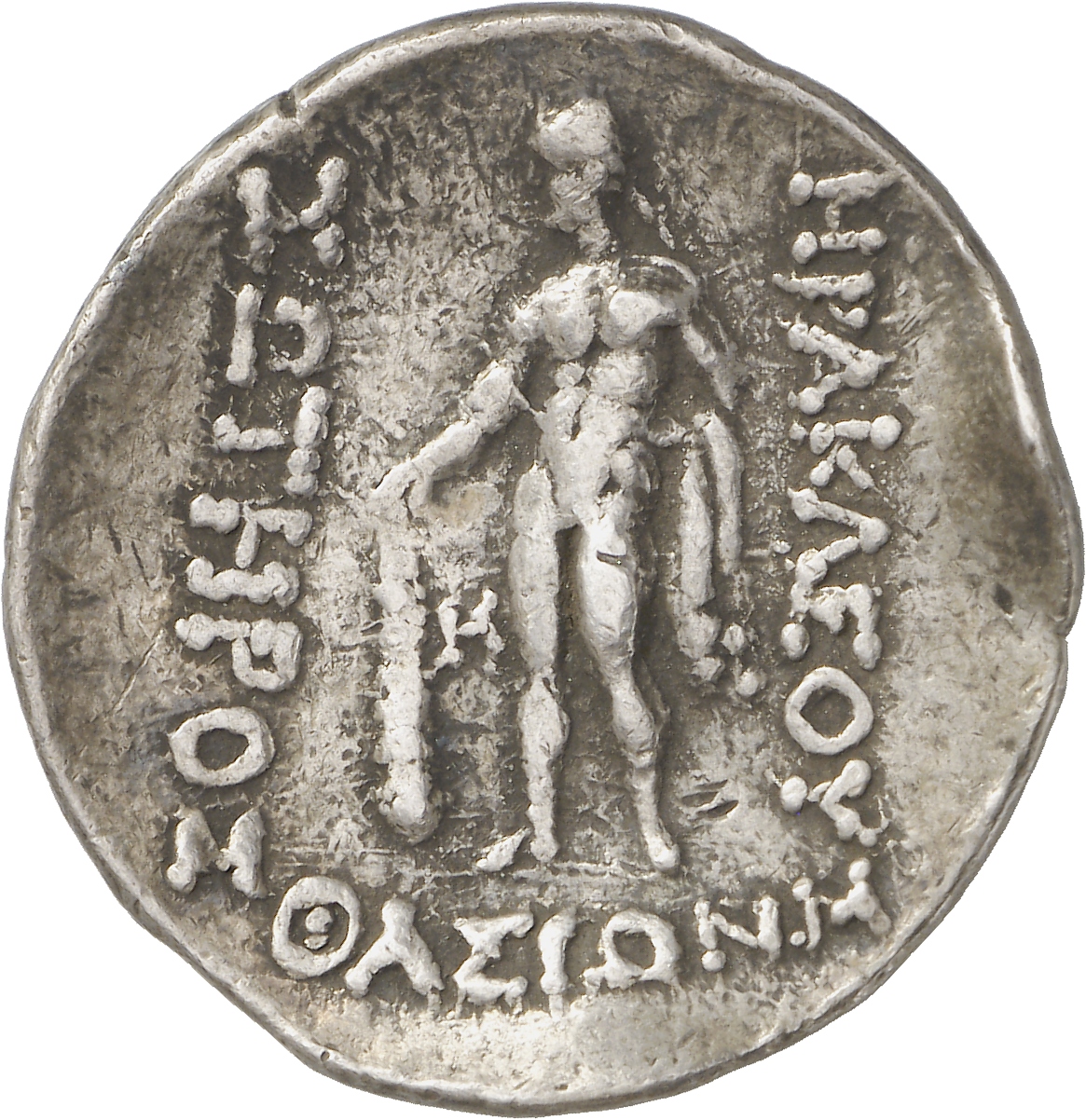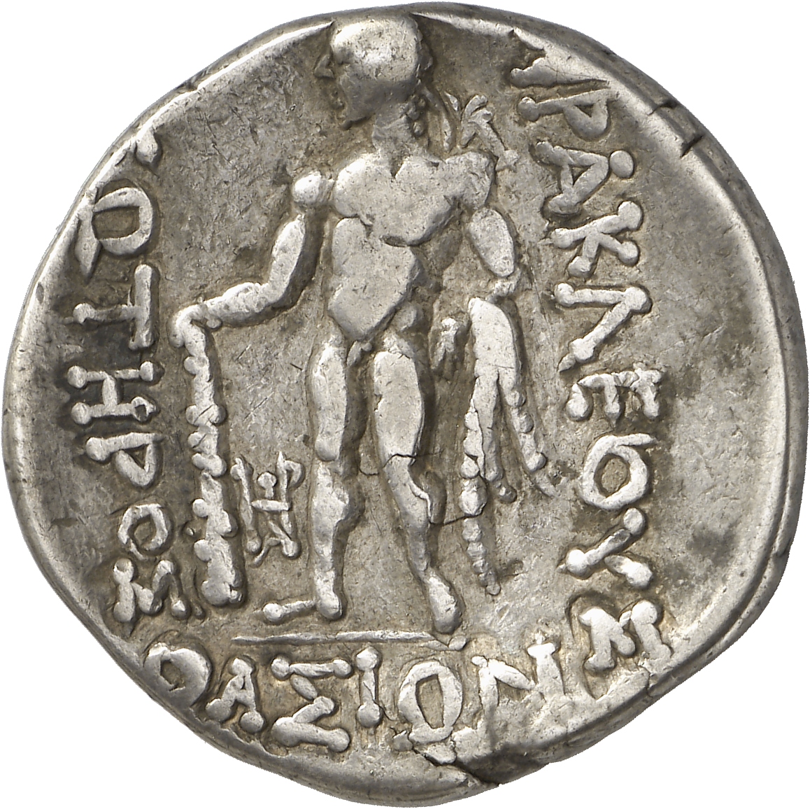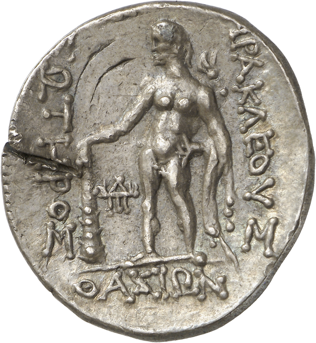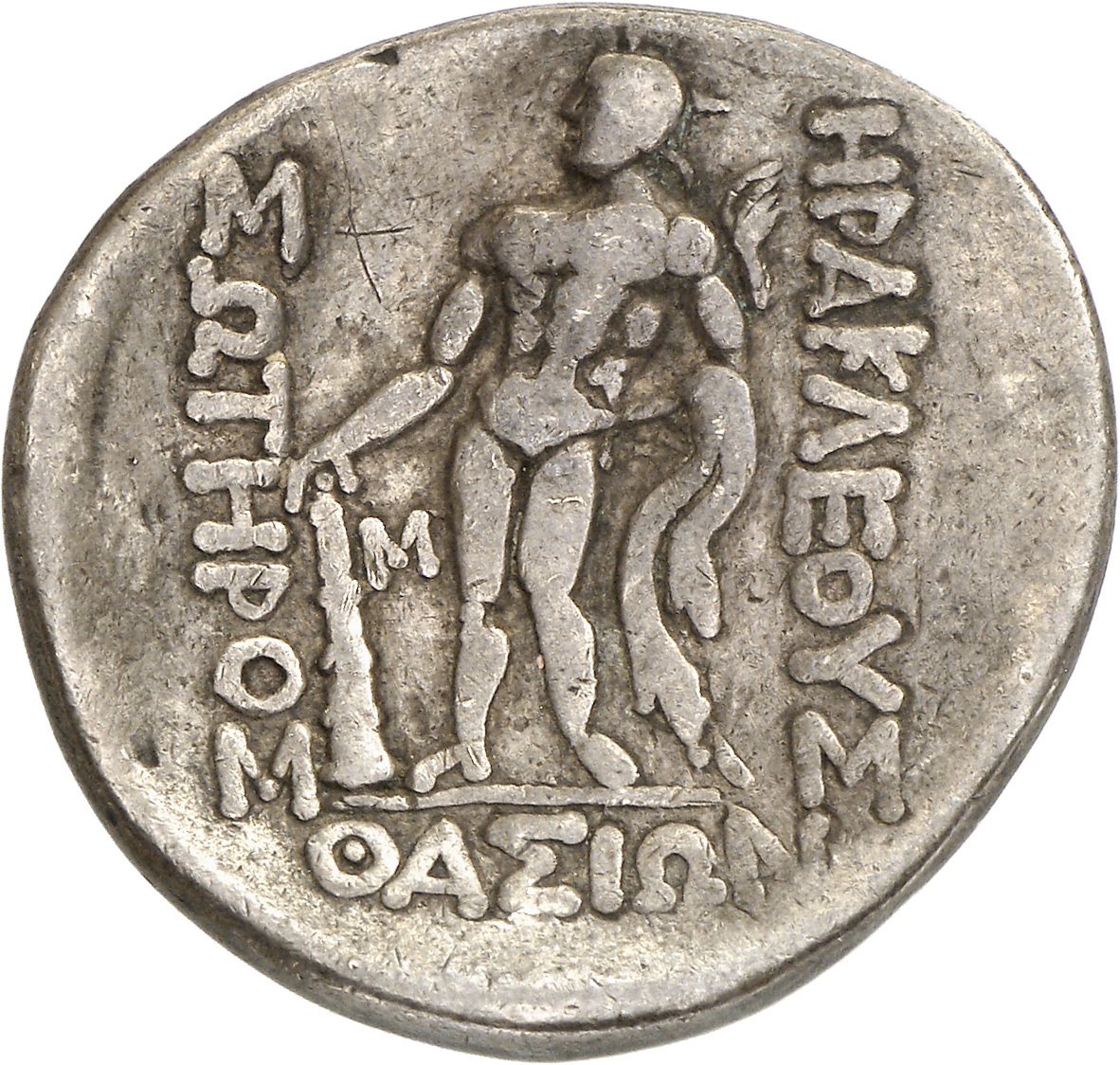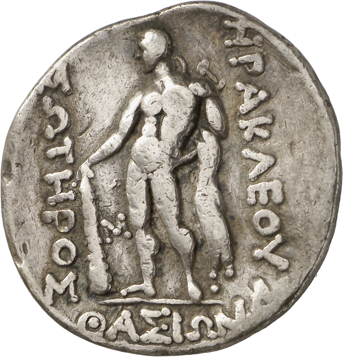- Nude Heracles standing facing, head left, resting right hand on club, left hand on hip, holding lion skin in left arm.