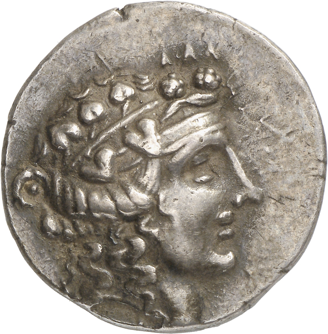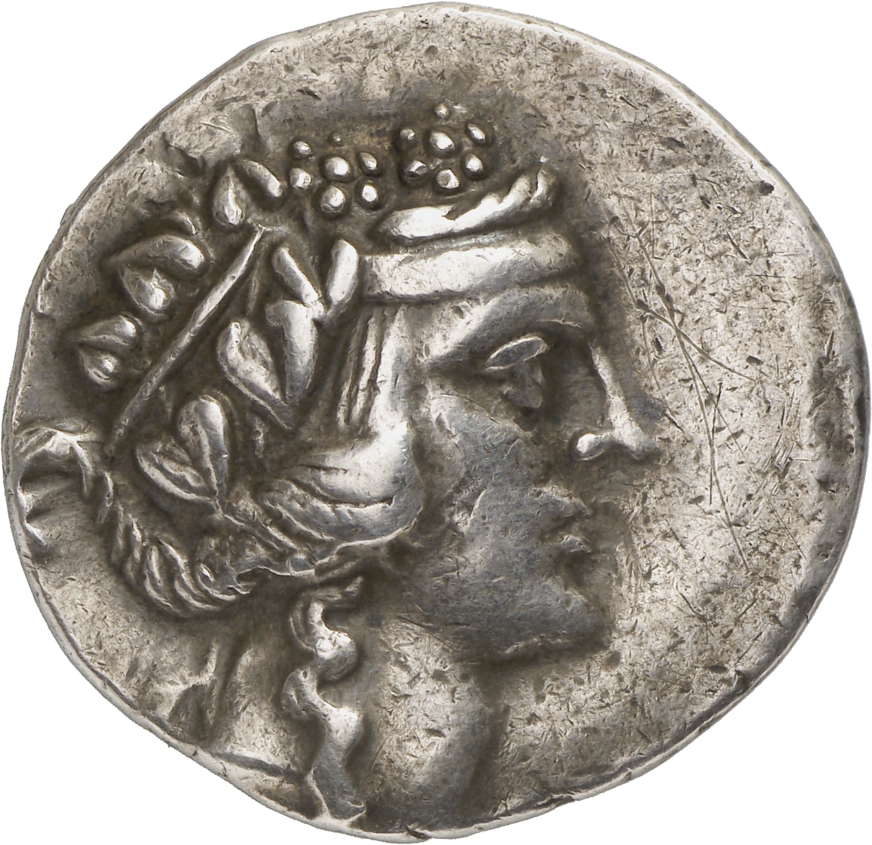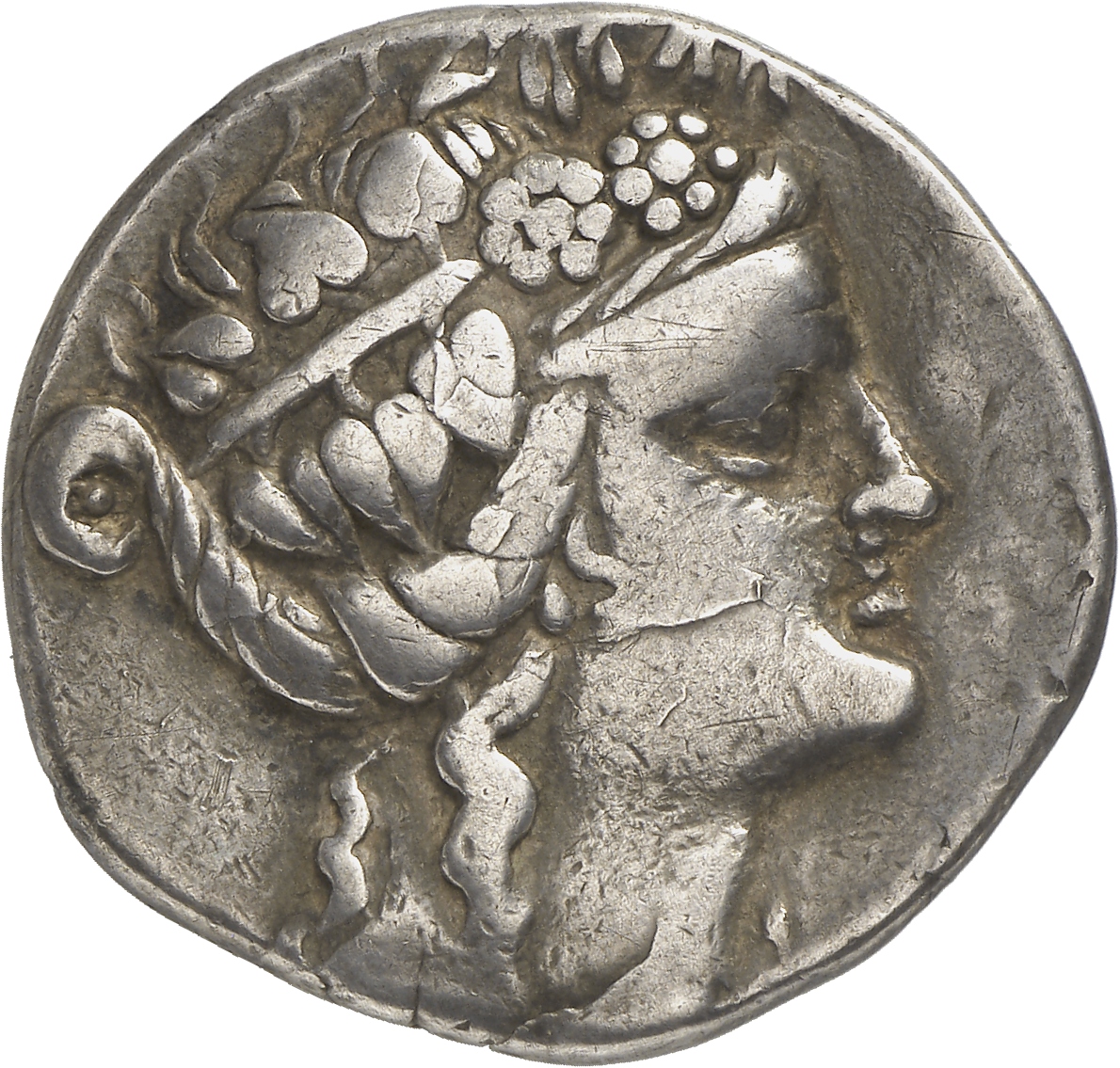 - Bearded head of Dionysus, left, wearing ivy wreath.