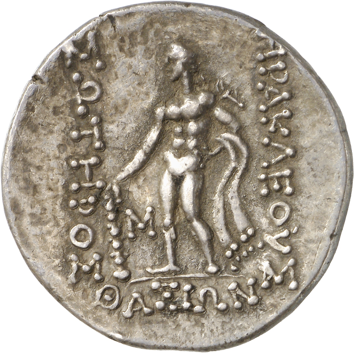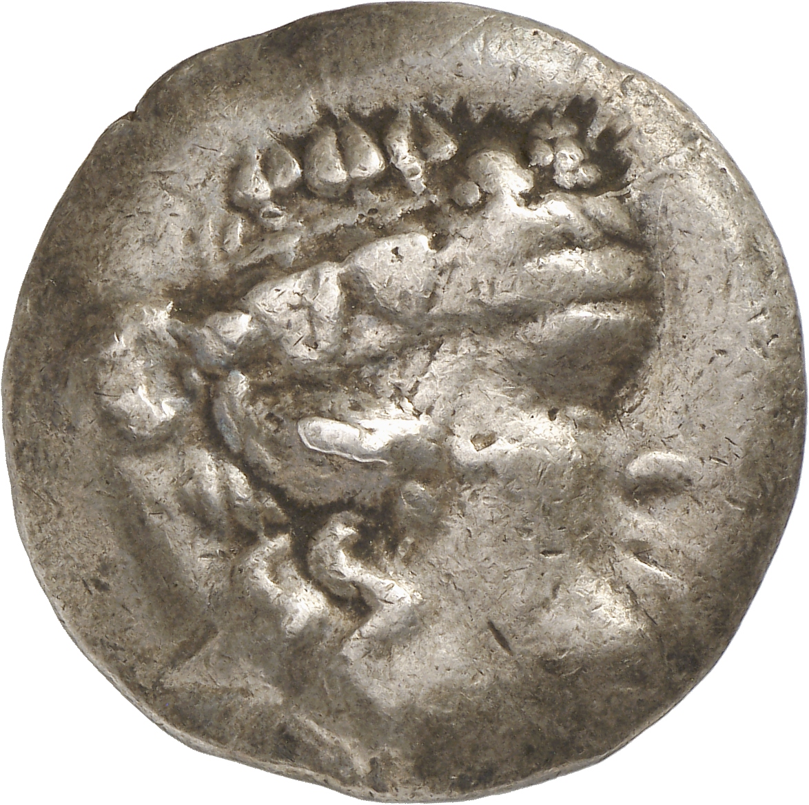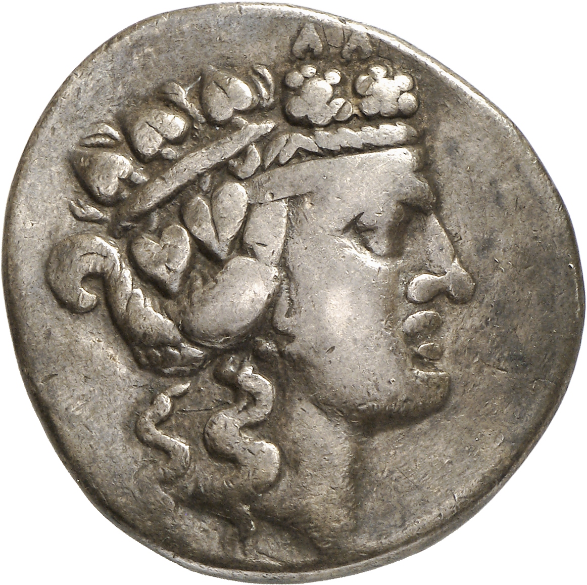 - Bearded head of Dionysus, left, wearing ivy wreath.