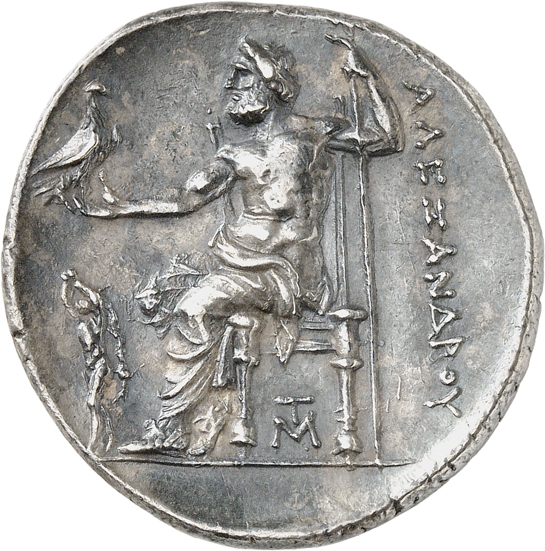 ΑΛΕΞΑΝΔΡΟΥ: Zeus seated on stool-throne left, eagle on outstretched right hand, sceptre in left hand