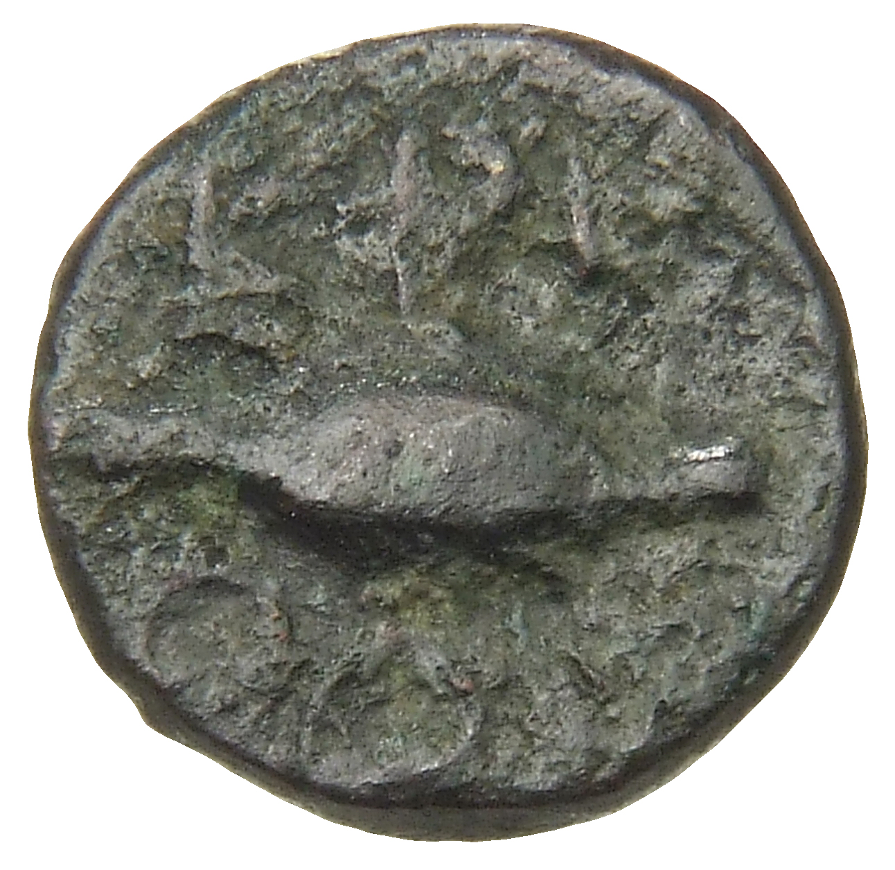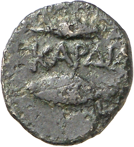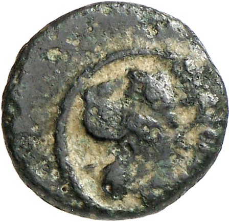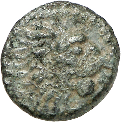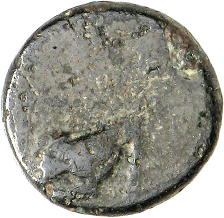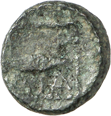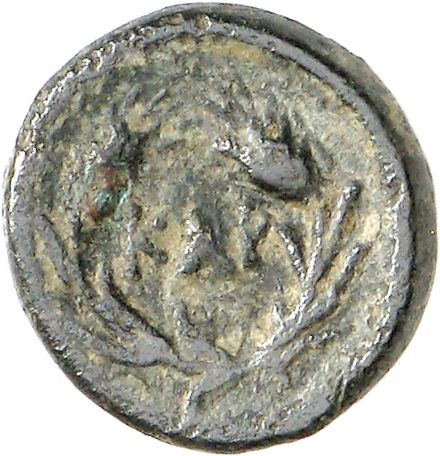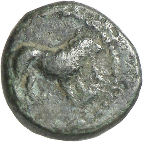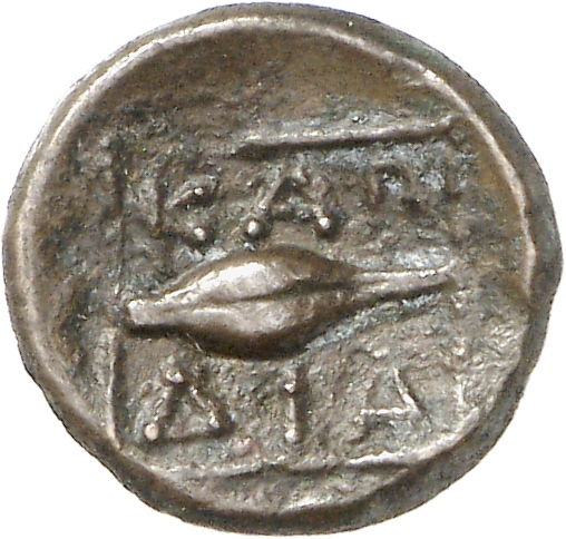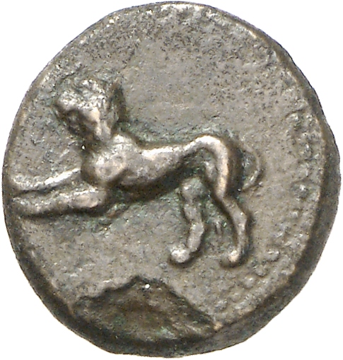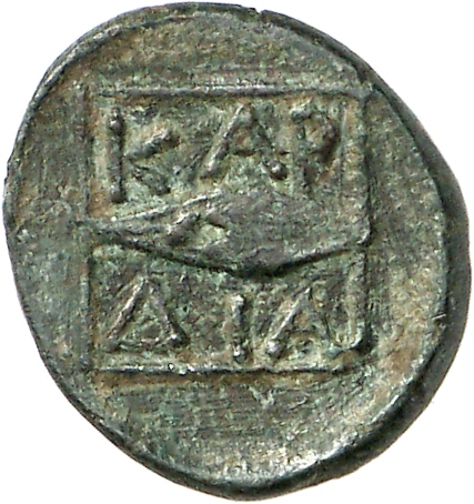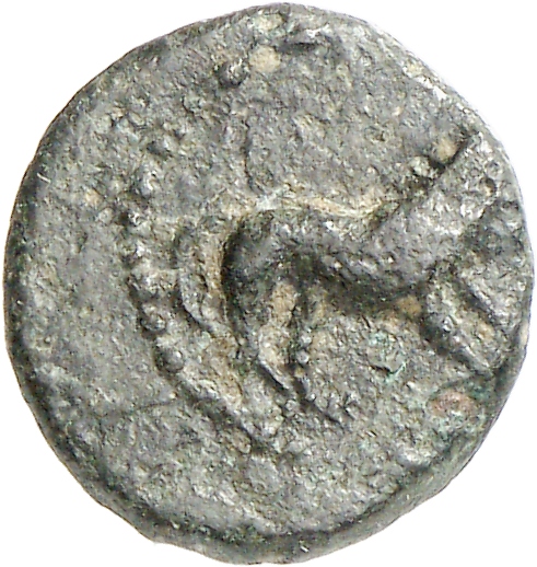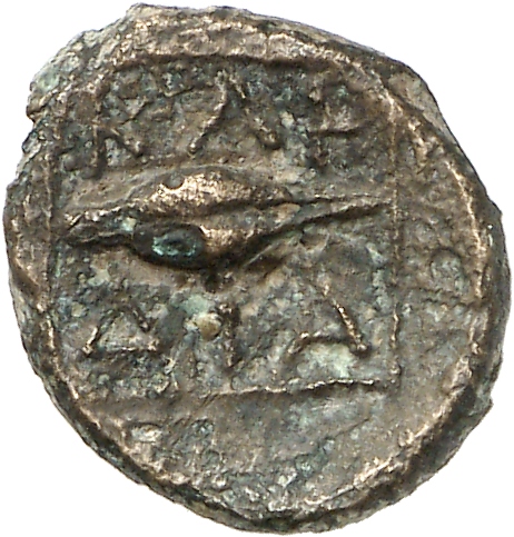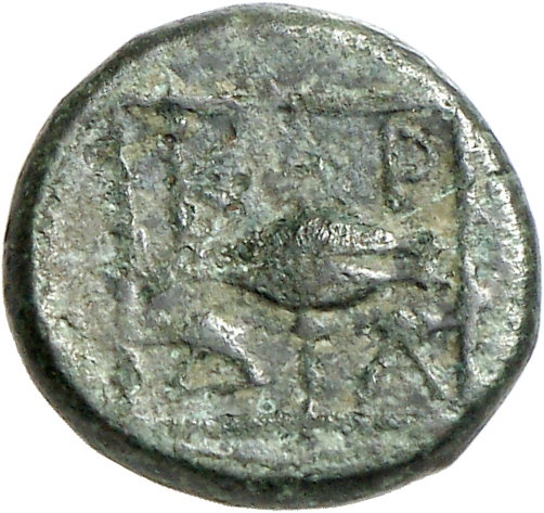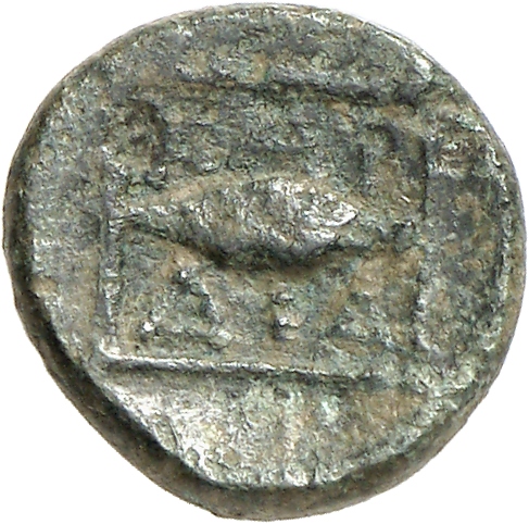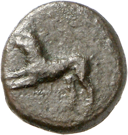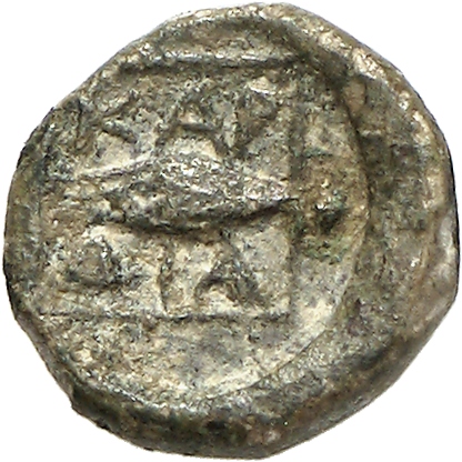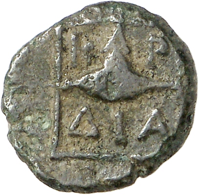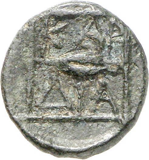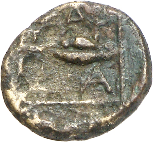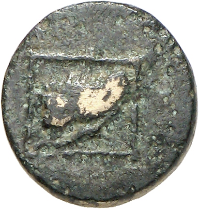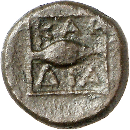 Ram's head, right, within dotted square border; within incuse square.