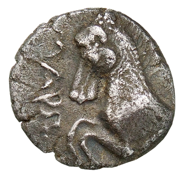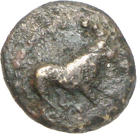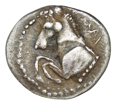 Forepart of prancing horse, left.