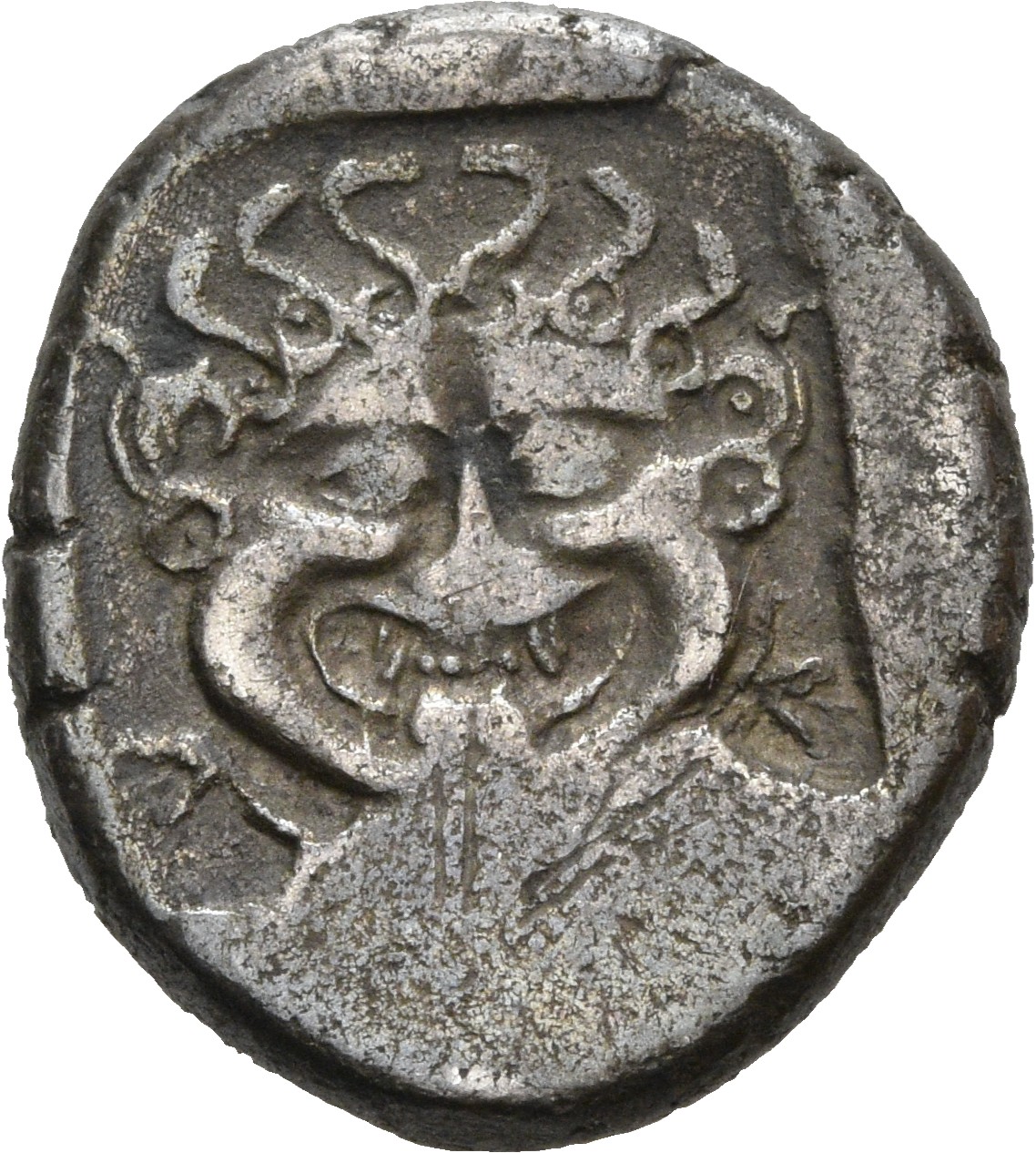 Laureate head of Artemis, right, wearing stephane, necklace and earrings.