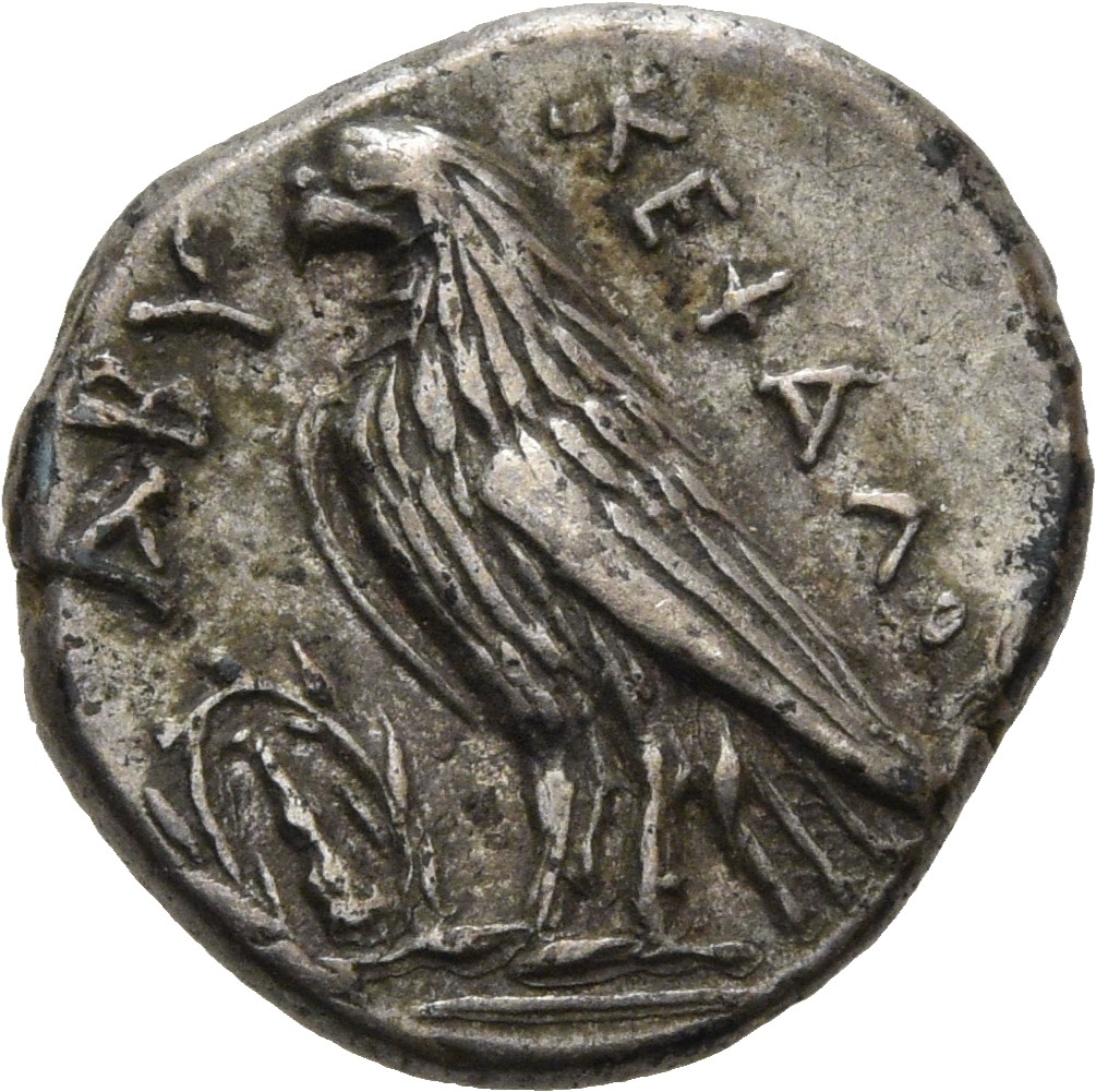 Laureate head of Apollo, right.