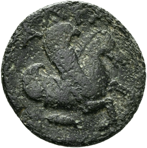 Laureate head of Zeus, right.