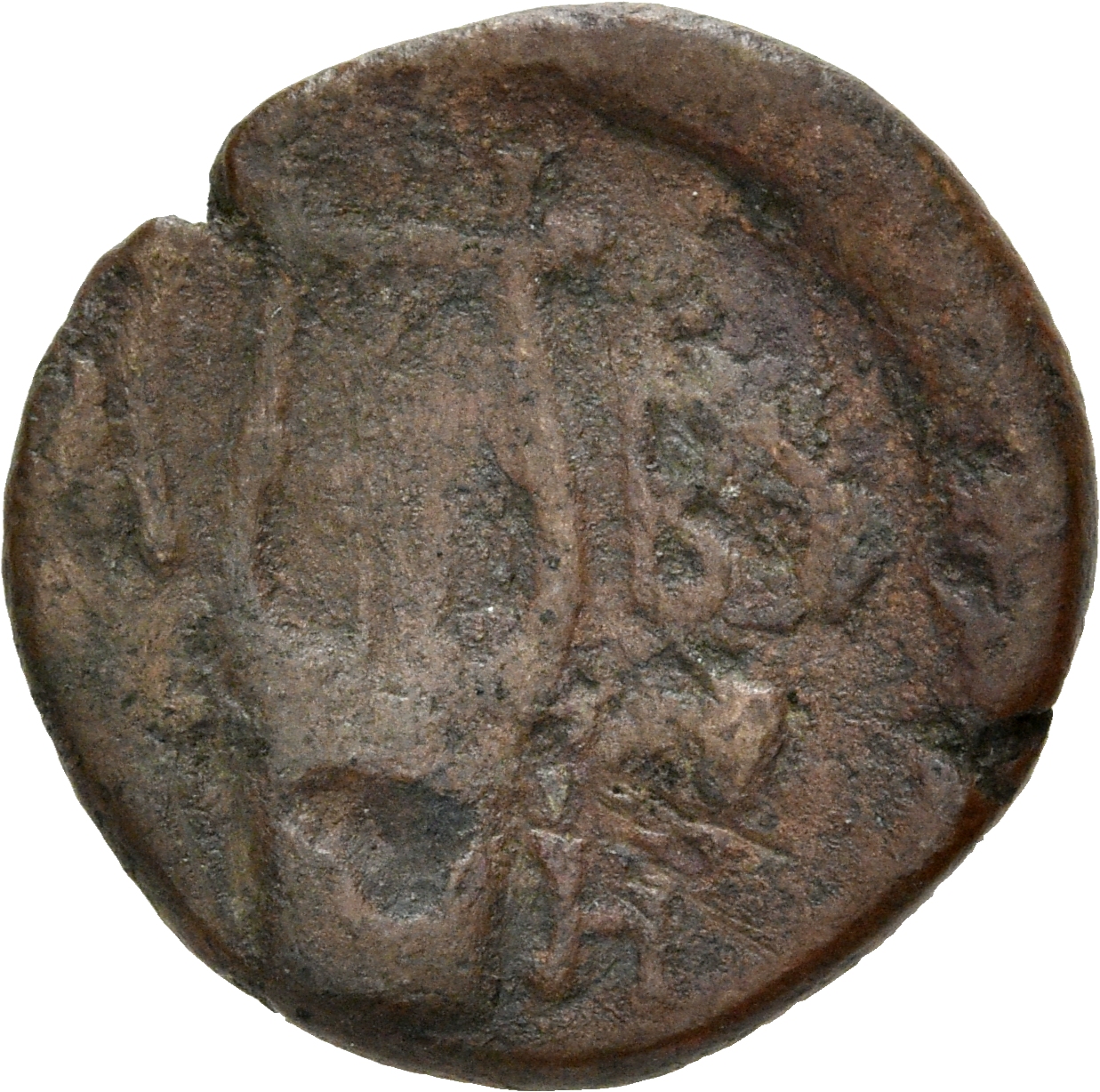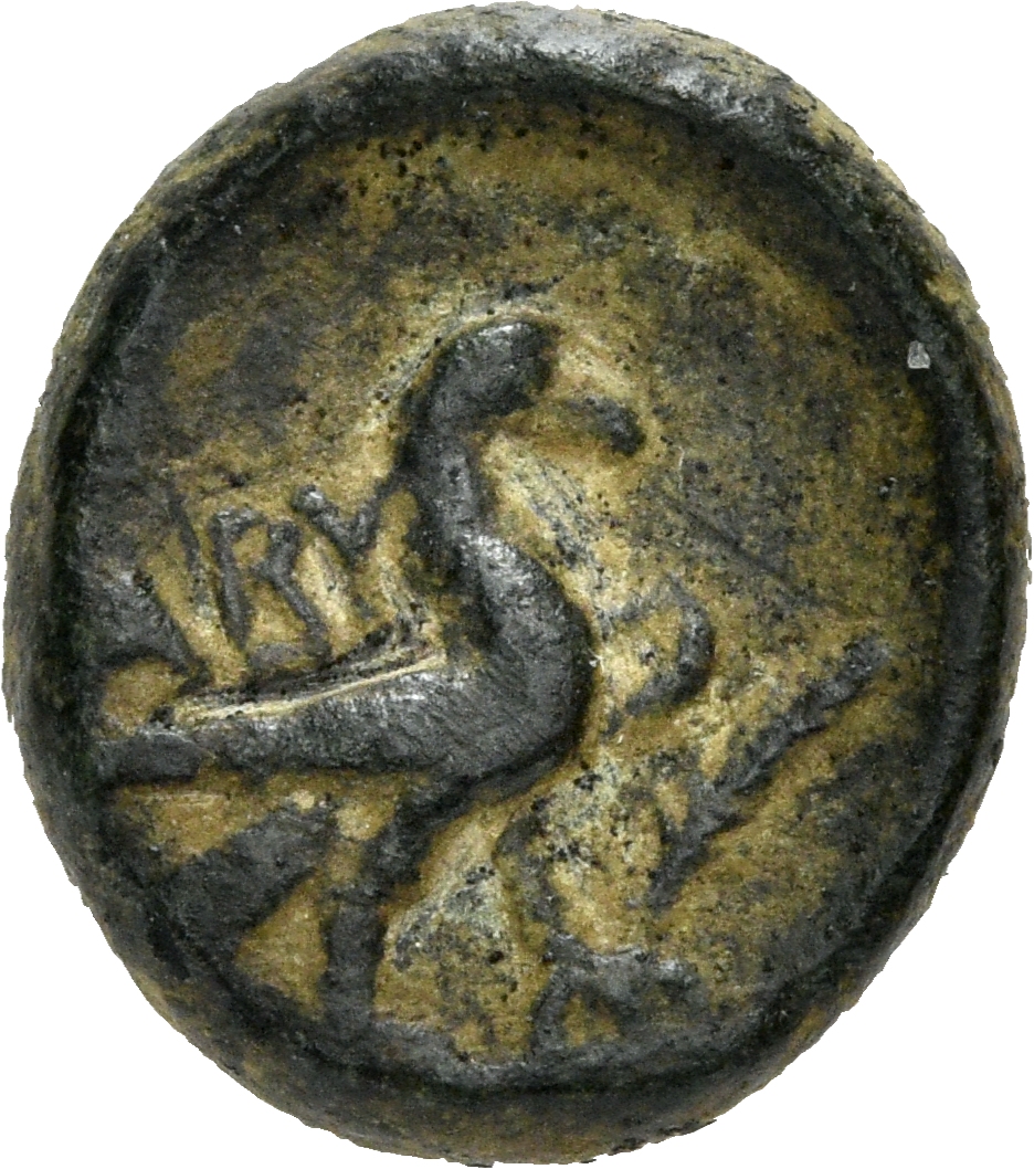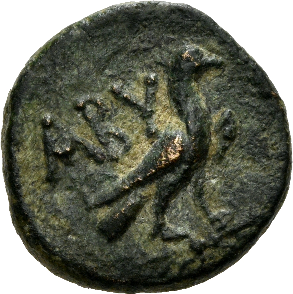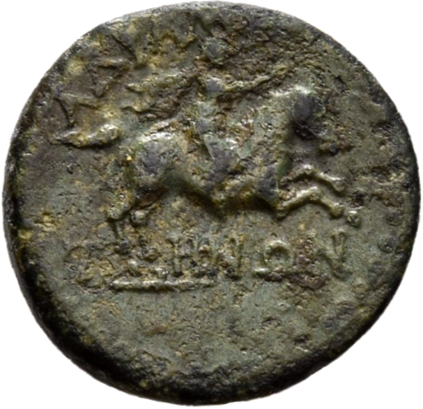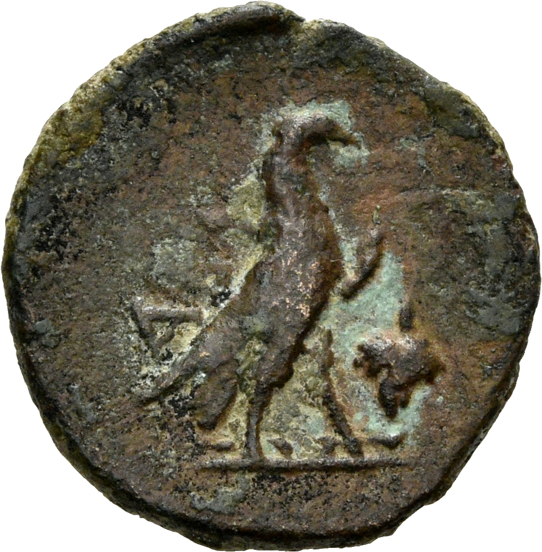 Laureate head of Zeus, right.