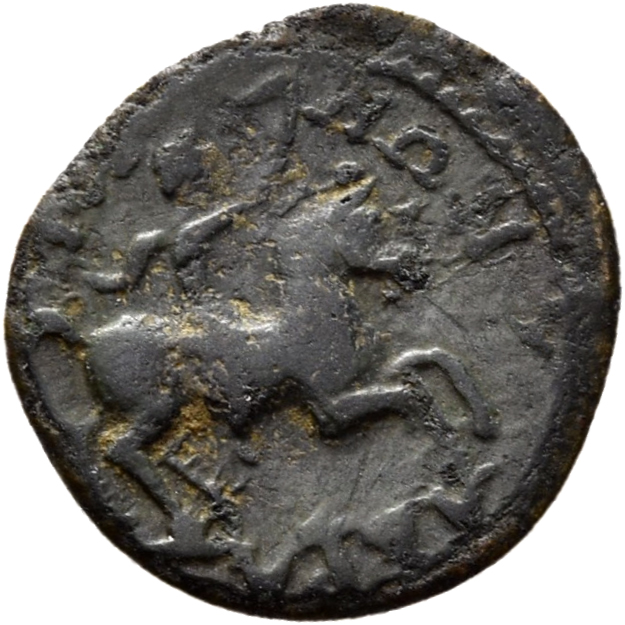 Horseman galopping right, wearing fluttering cloak, raising right arm.