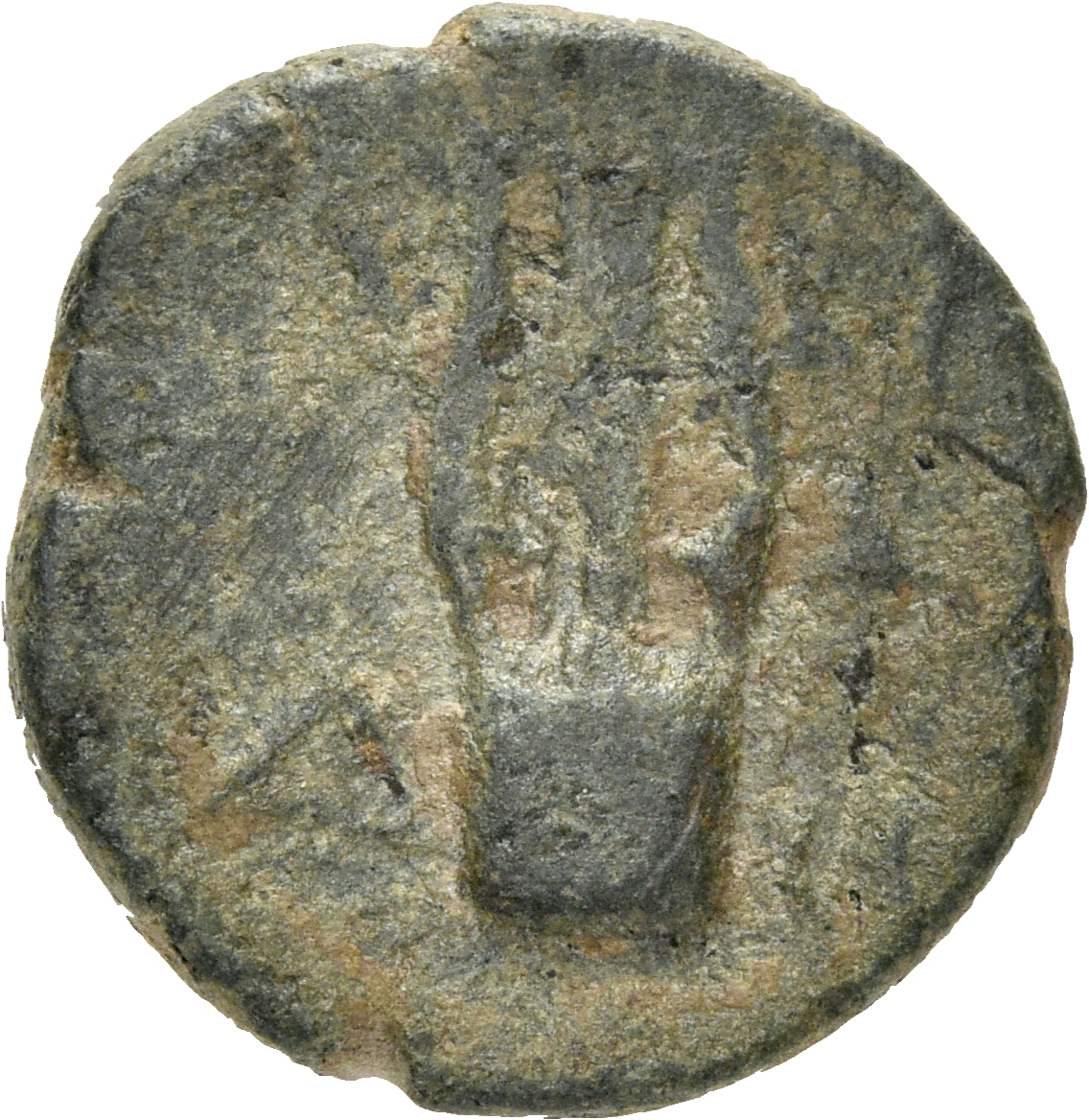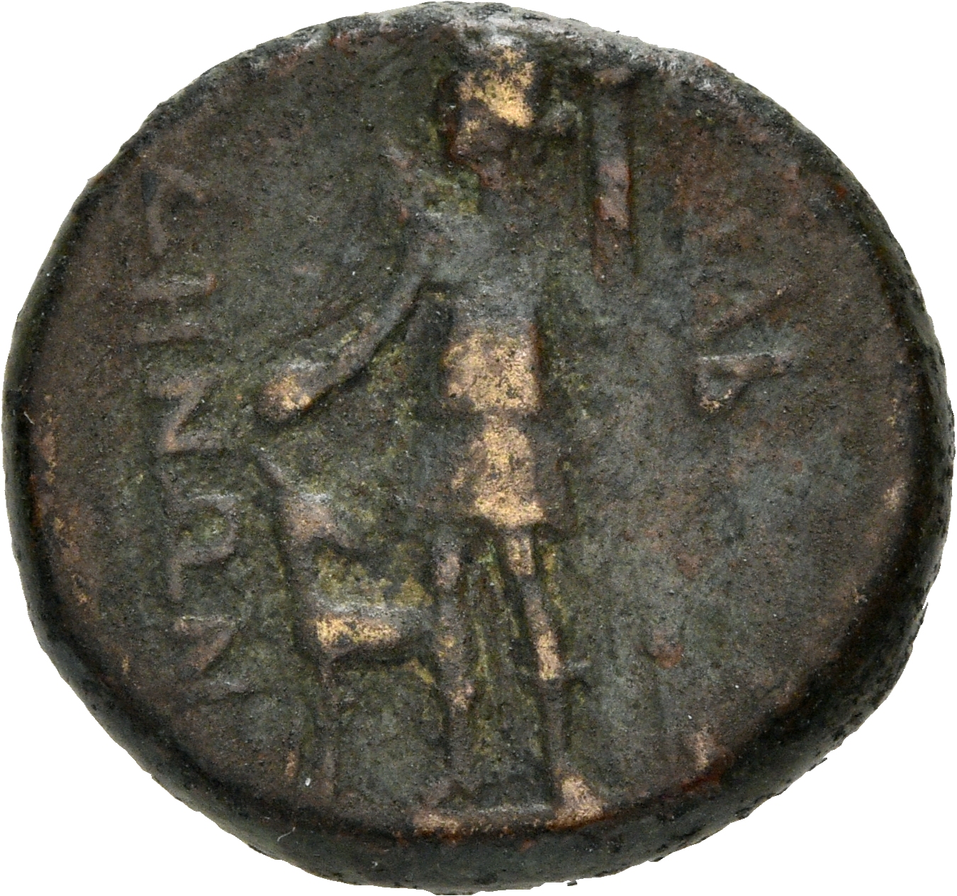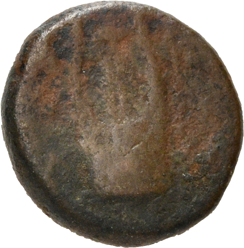 Artemis standing left, holding patera and torch; at her feet, stag; behind, corn-ear.