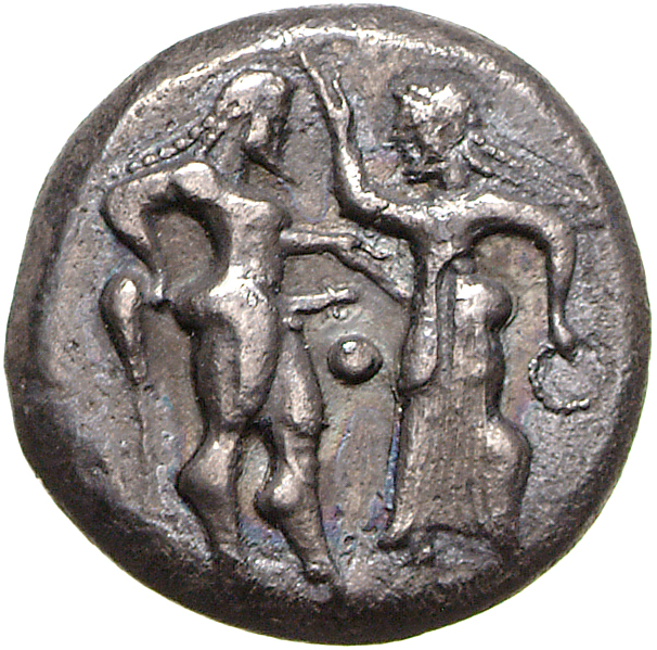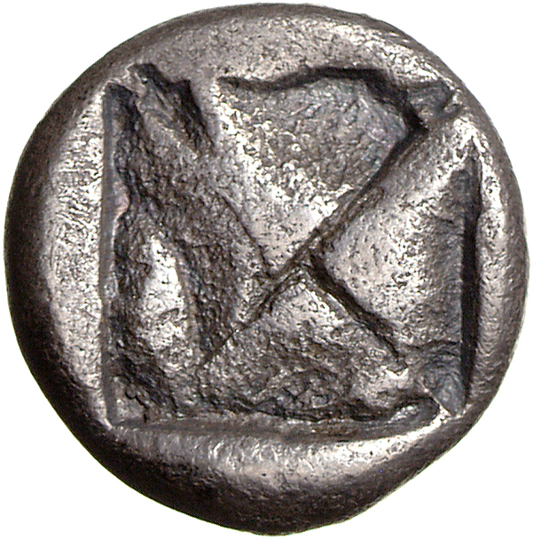 Warrior standing right, holding sword and shield in form of crescent within incuse square.