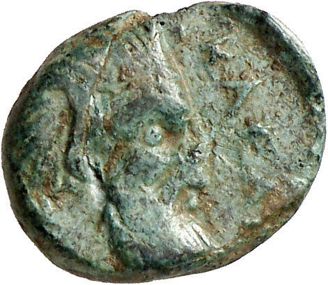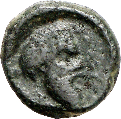 Diademed female head, left, in linear square; all within shallow incuse square.