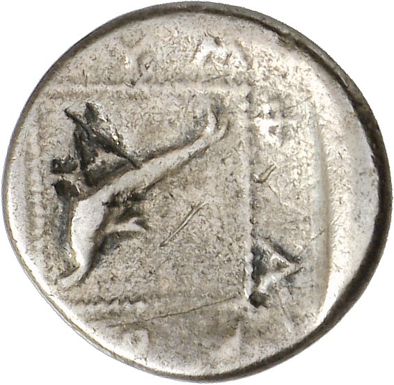 Nude Apollo standing left, chlamys over shoulders, holding patera in outstretched right hand and branch in left hand; all within incuse square.