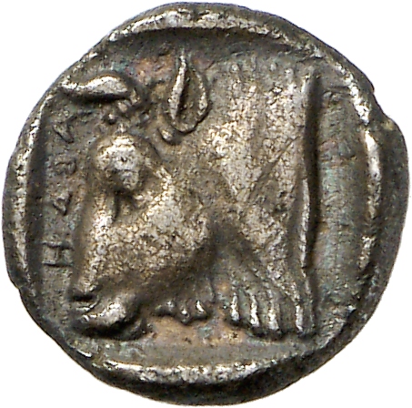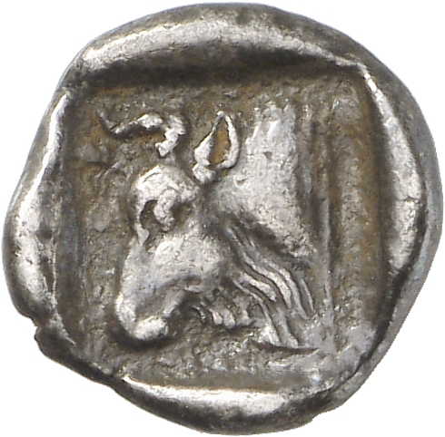 Nude Heracles seated left on rock, head facing, rock covered with a lion skin, holding club in his right hand; all within a shallow incuse square.