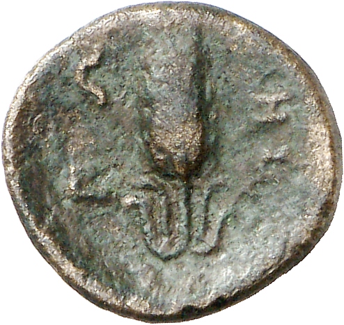 Great God standing left, wearing taenia and long garment, holding patera and cornucopia.