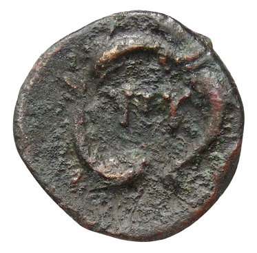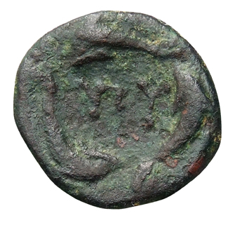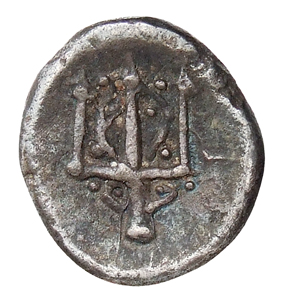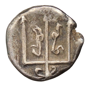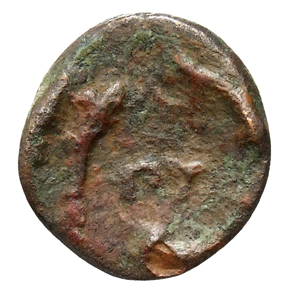Forepart of a bull standing left on dolphin, raising right forehoof.