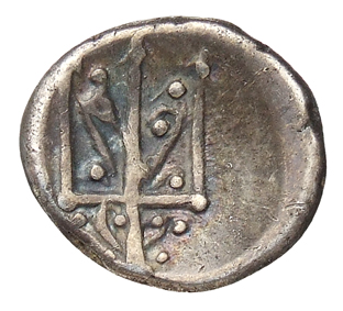 Artemis standing right, holding a wreath in right hand and bow with arrow in left hand; at her feet, stag; all within incuse square.