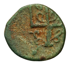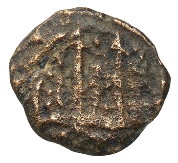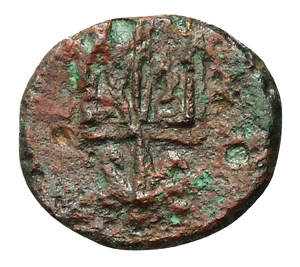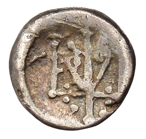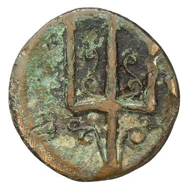 Cult statue of Artemis, standing facing, wearing kalathos, holding wreath and bow; behind her, stag; all within incuse square.