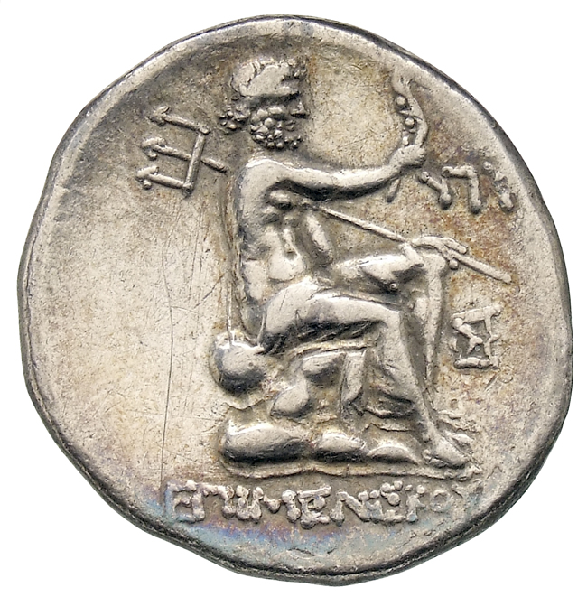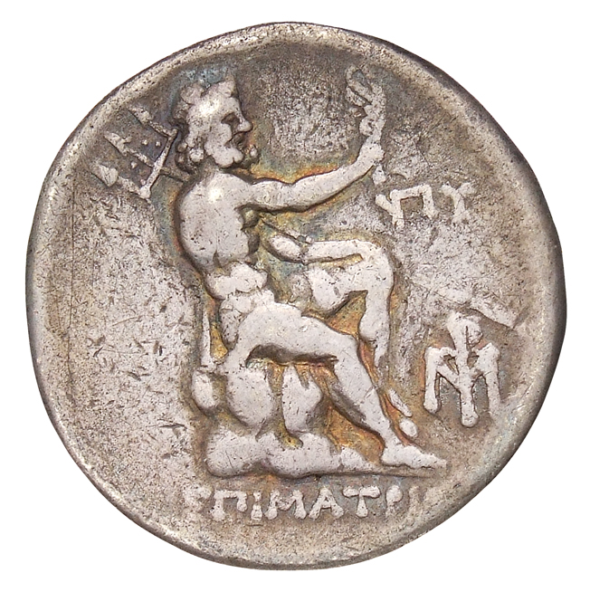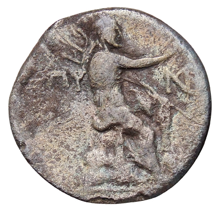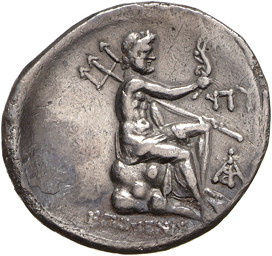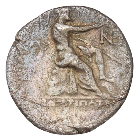 Poseidon seated right on rock, holding aplustre and trident.