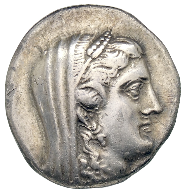 Veiled head of Demeter, right, wearing corn wreath.