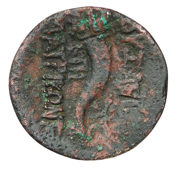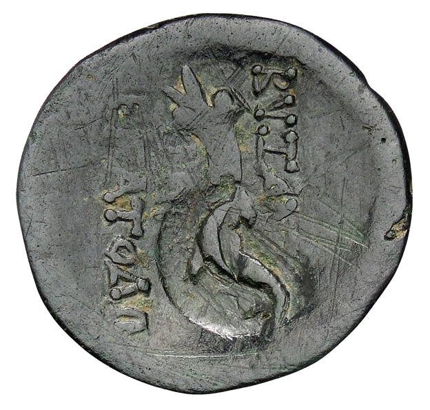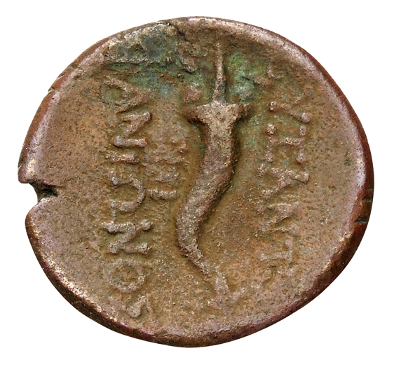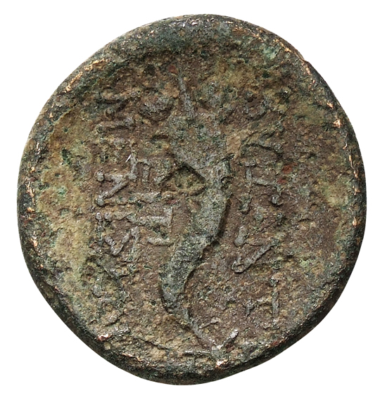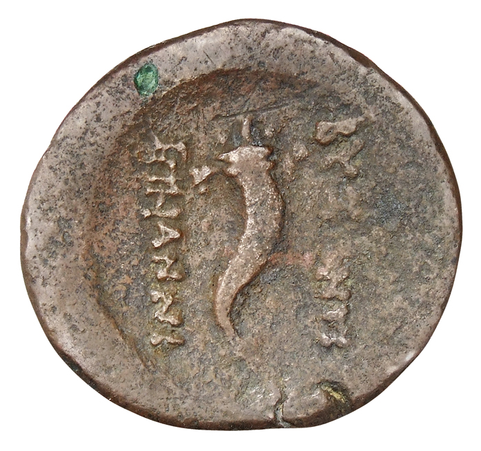 Bearded male head, right, wearing taenia (?).