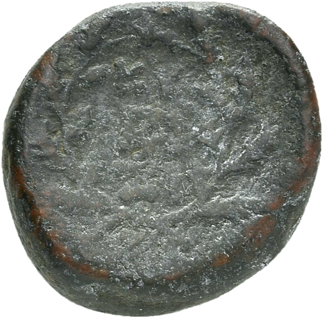 City ethnic (in two lines) above and below a monogram, all within an oak wreath bound at the bottom.