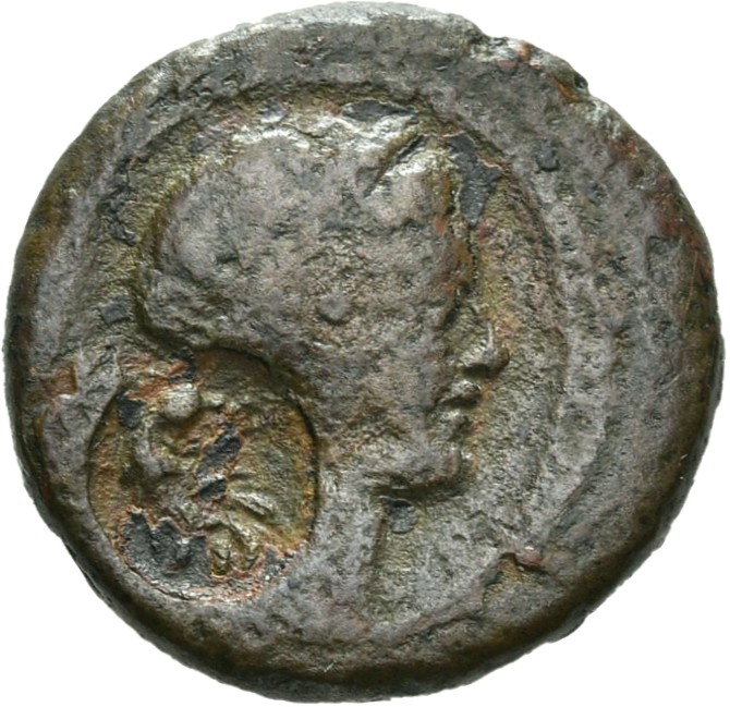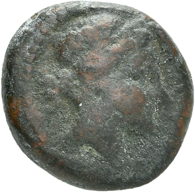 Head of Kore right with hair gathered at nape and corn wreath. Border of dots.