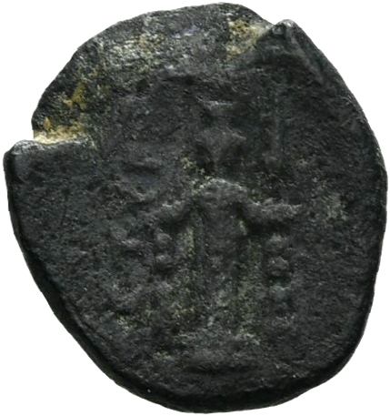 Cybele enthroned left, holding patera in outstretched right hand, resting left arm on tympanum.