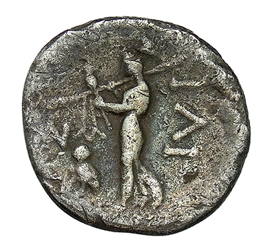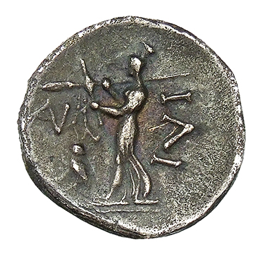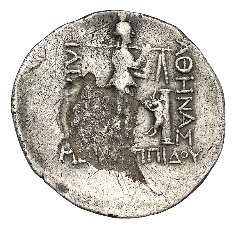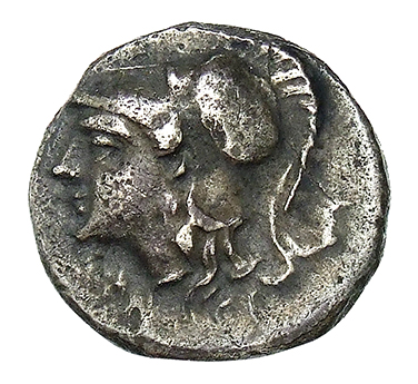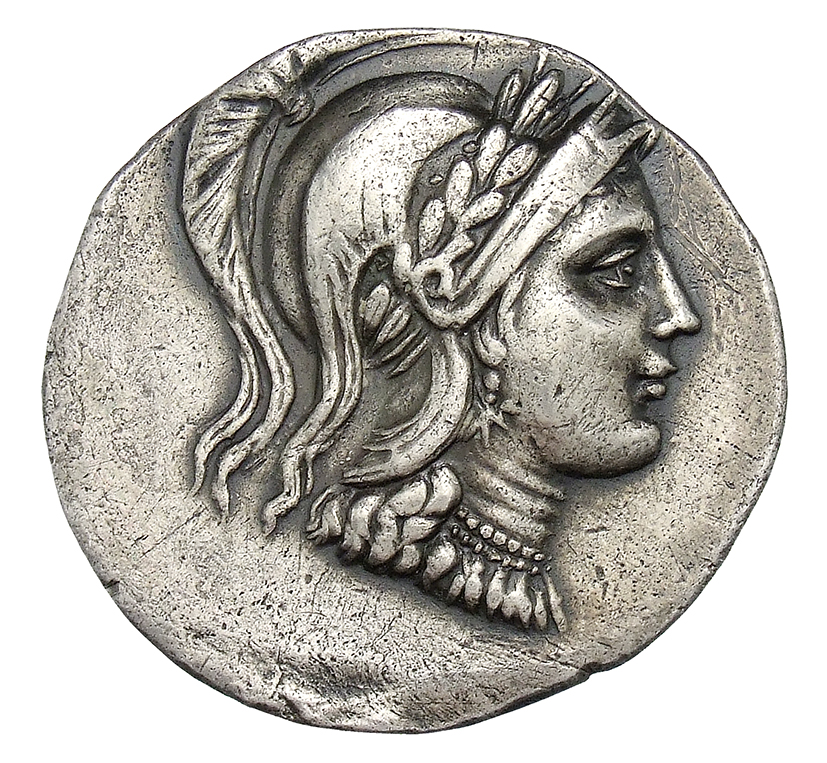 Head of Athena to right with Attic helmet, decorated with laurel wreath.