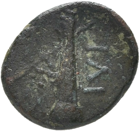 Athena Ilias standing left, wearing kalathos, holding spindle and spear.