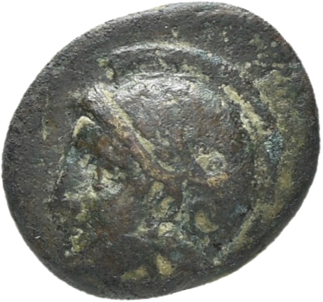 Head of Athena, right, wearing crested Corinthian helmet. Border of dots.