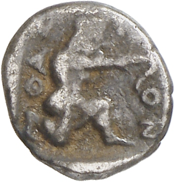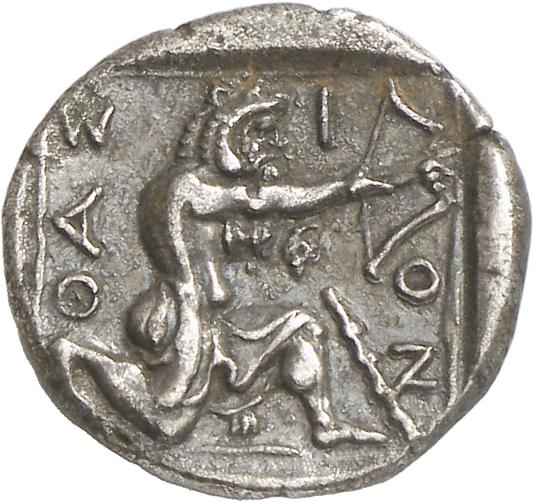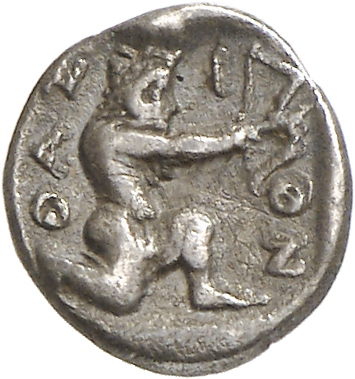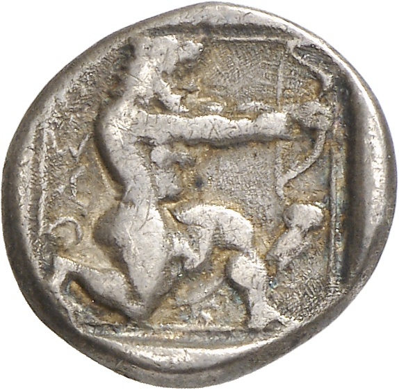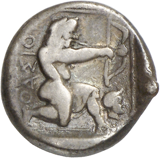 Heracles kneeling right, wearing lion skin, drawing bow; all within linear square.
