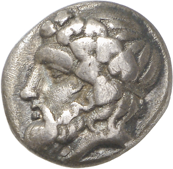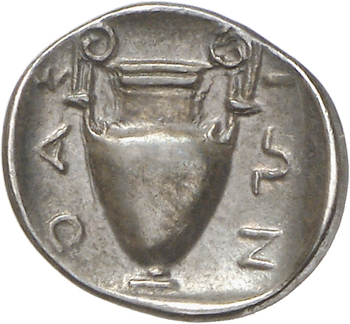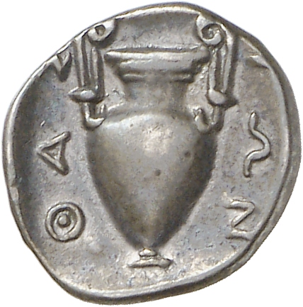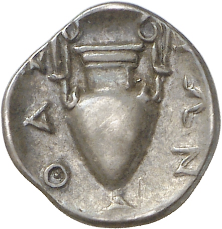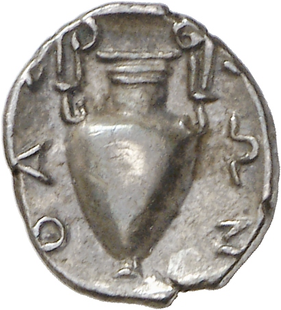 Bearded head of Dionysus, left, wearing ivy wreath.