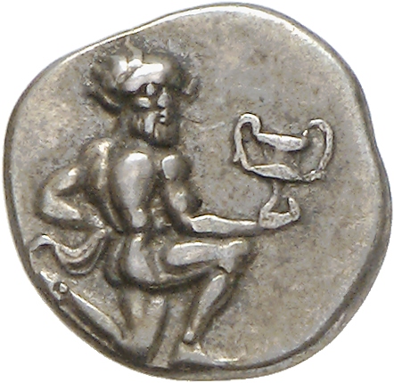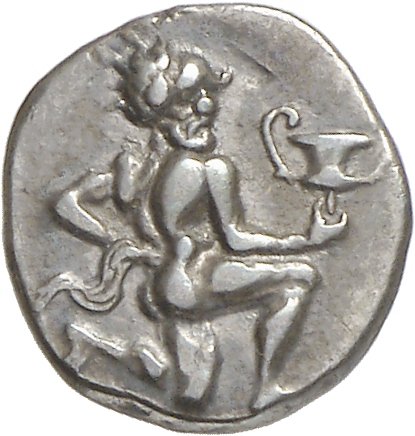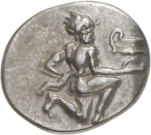 Silenus kneeling right, head facing, holding cantharus in his right hand and resting his left on his hip.