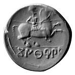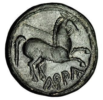 Horse, galloping, with reins loose in the air, to right, Legend on air