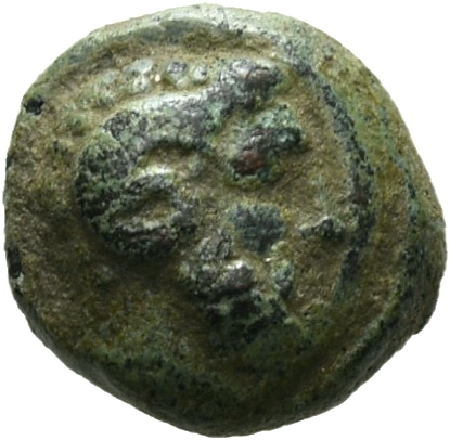 Diademed head of deified Alexander the Great with horn of Ammon, right.