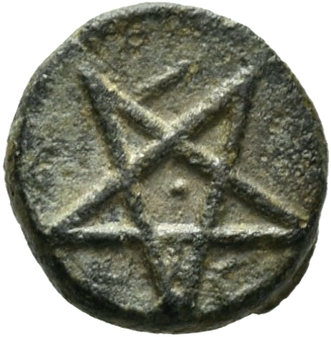 Heracles kneeling right, wearing lion skin, drawing bow; all within linear square.