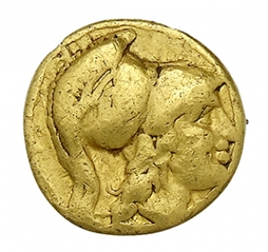 Head of Athena right wearing Corinthian helmet with crest