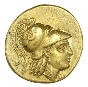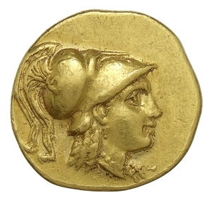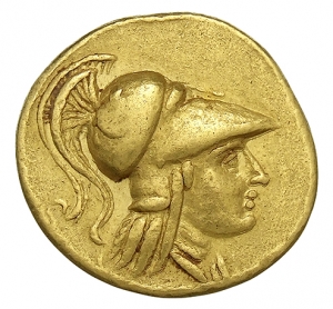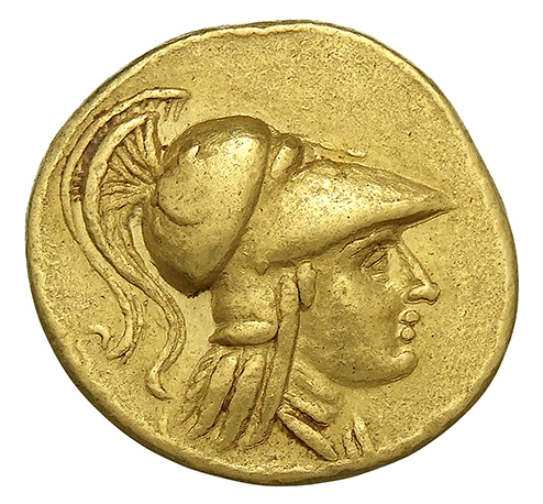 Head of Athena right wearing Corinthian helmet with crest
