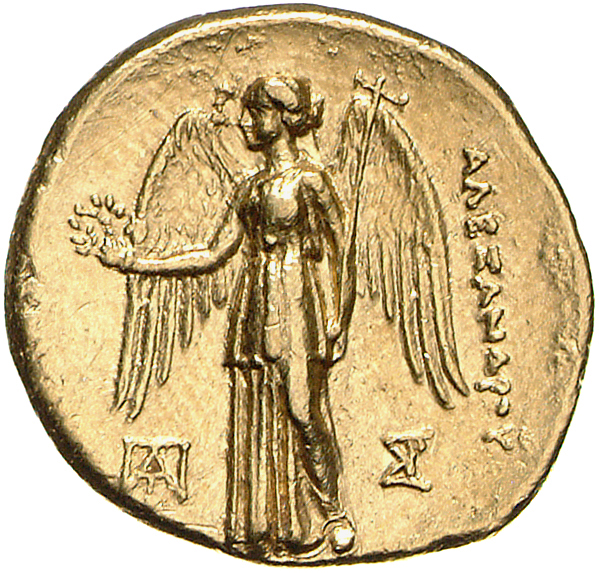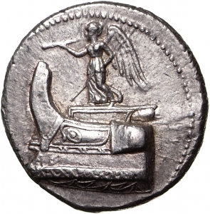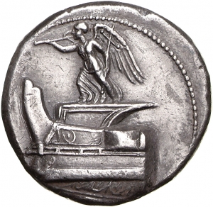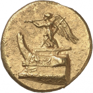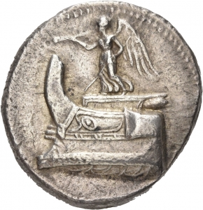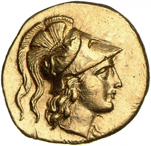 Veiled Head of deified Arsinoe II right, with ram's horn, wearing diademed stephane, lotus scepter over far shoulder, sometimes with serpent coiled around shaft, dotted border