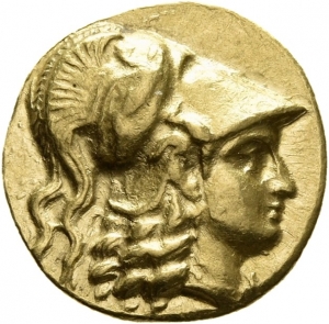 Head of Athena right wearing Corinthian helmet with crest; griffin on bowl of helmet