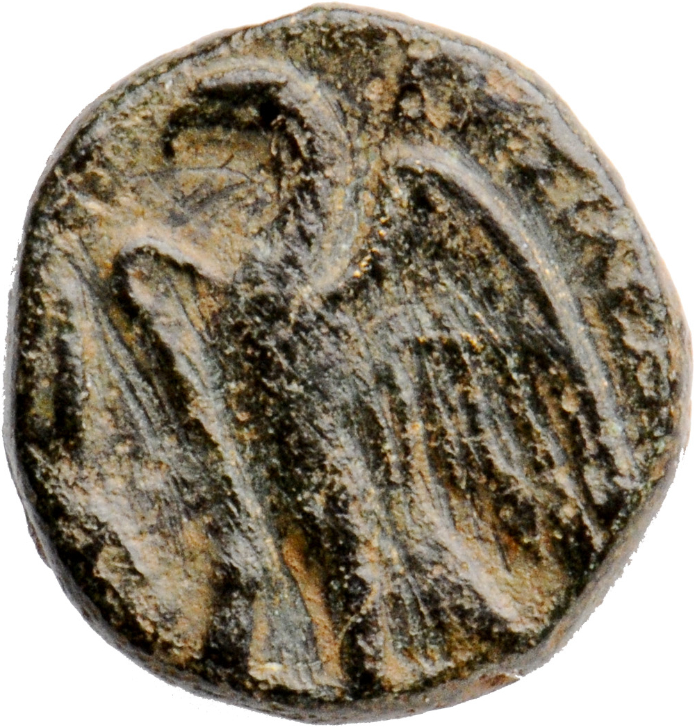 ΠΤΟΛΕΜΑΙΟΥ l. ΒΑΣΙΛΕΩΣ r.: Eagle with closed wings standing left on thunderbolt, Head reverted, holding double Cornucopiae bound with royal diadem over shoulder, dotted border
