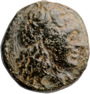 Jugate busts right of Sarapis and Isis, both draped, the god laureate, with miniature atef crown above his foreHead, the goddess crowned with grain, with miniature horned disc above foreHead, dotted border