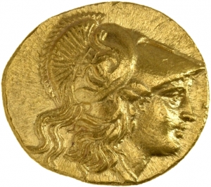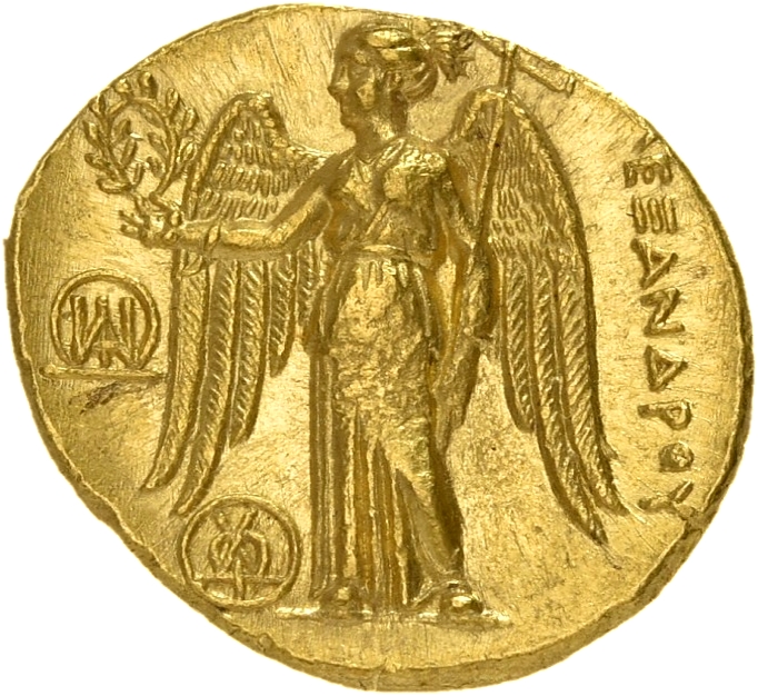 BAΣΙΛΕΩΣ ΔHMHTPIOY ΘEOY NIKATOPOΣ: Zeus seated on high-backed throne left, resting on scepter and extending right hand through legend, holding Nike who faces left, extending wreath toward edge of coin