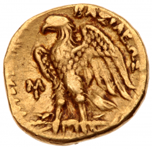 ΠΤΟΛΕΜΑΙΟY l., ΒΑΣΙΛΕΩΣ r.: Eagle with spread wings standing left on thunderbolt