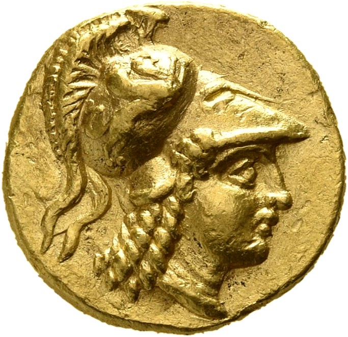 Head of Athena right, wearing crested Corinthian helmet ornamented with coiled serpent on bowl