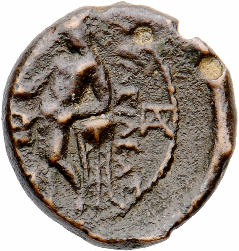 BAΣΙΛΕΩΣ ΣΕΛΕΥΚΟΥ: Apollo standing left, testing arrow and resting left hand on grounded bow