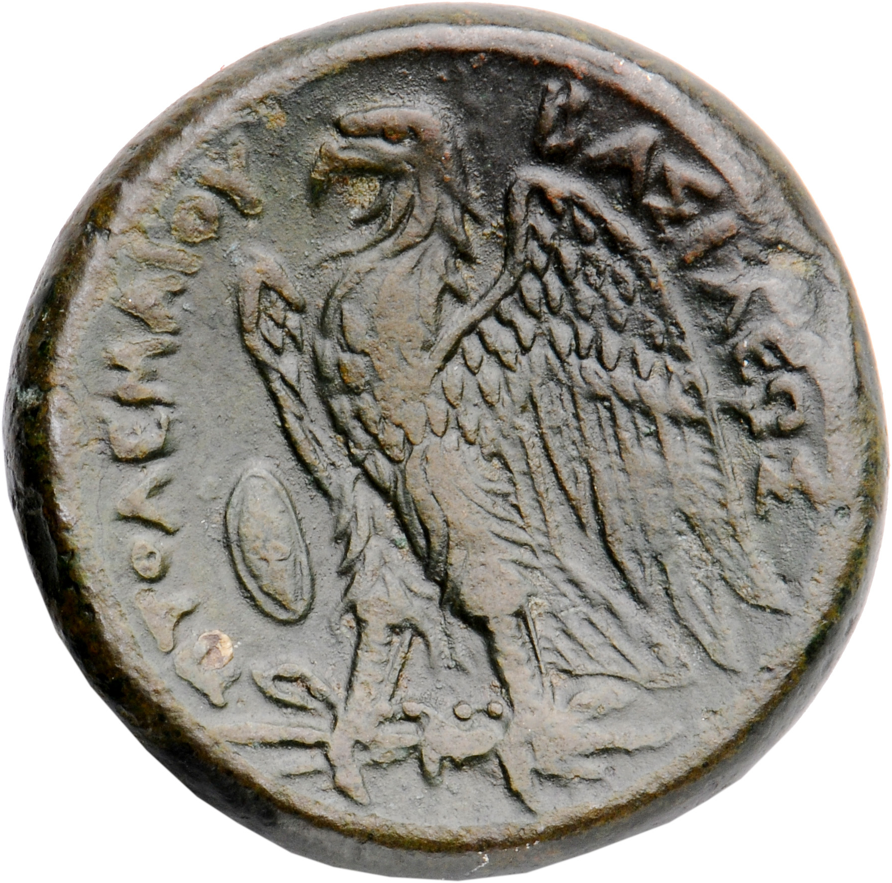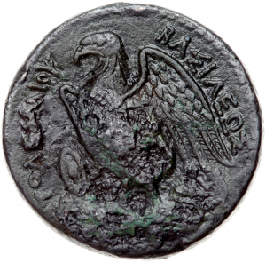 ΠΤΟΛΕΜΑΙΟΥ on l. ΒΑΣΙΛΕΩΣ on r.: Eagle with spread wings standing left on thunderbolt