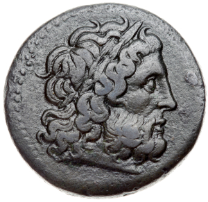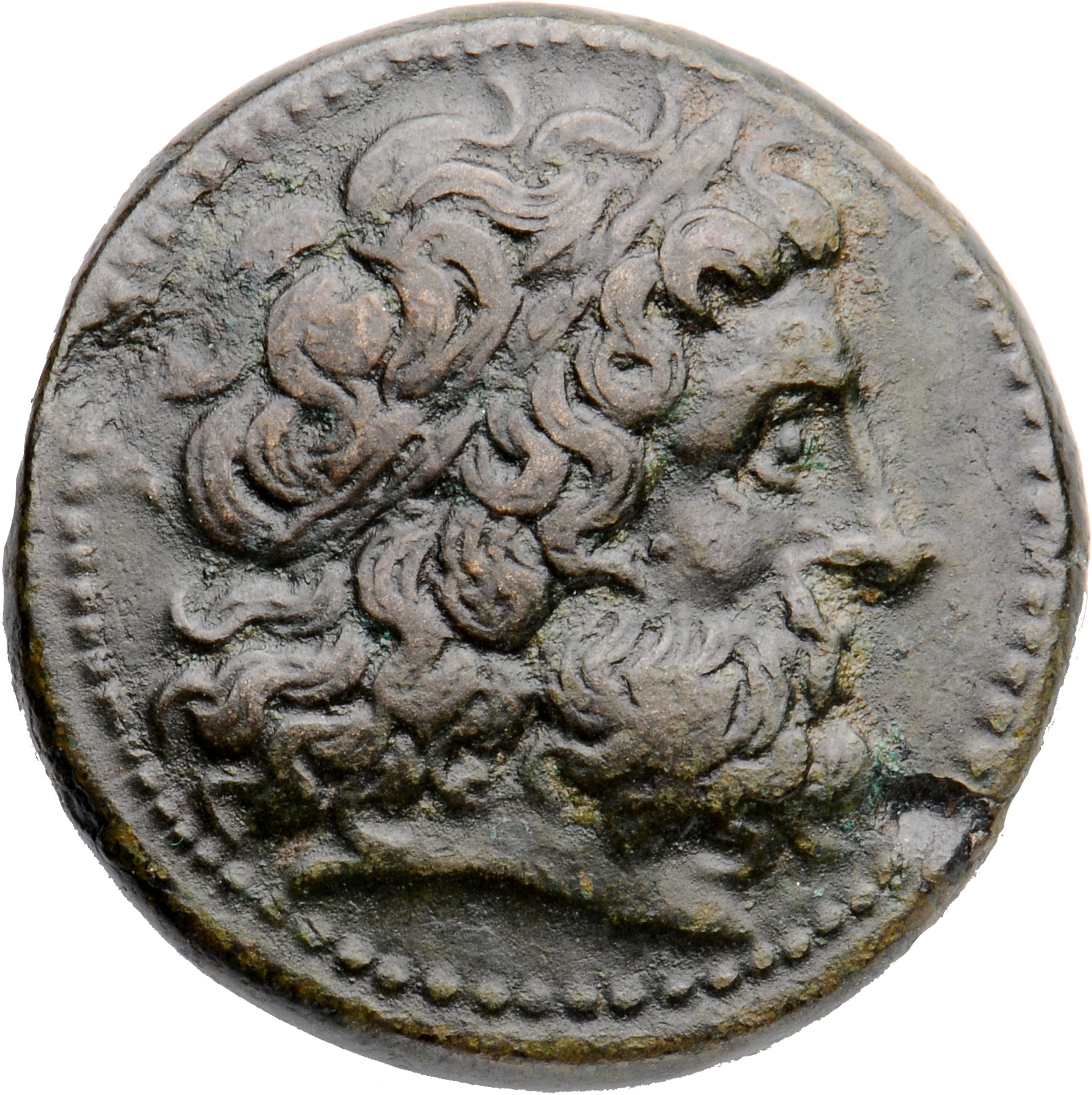 Laureate Head of Zeus right, of idealizing Alexandrian style, dotted border