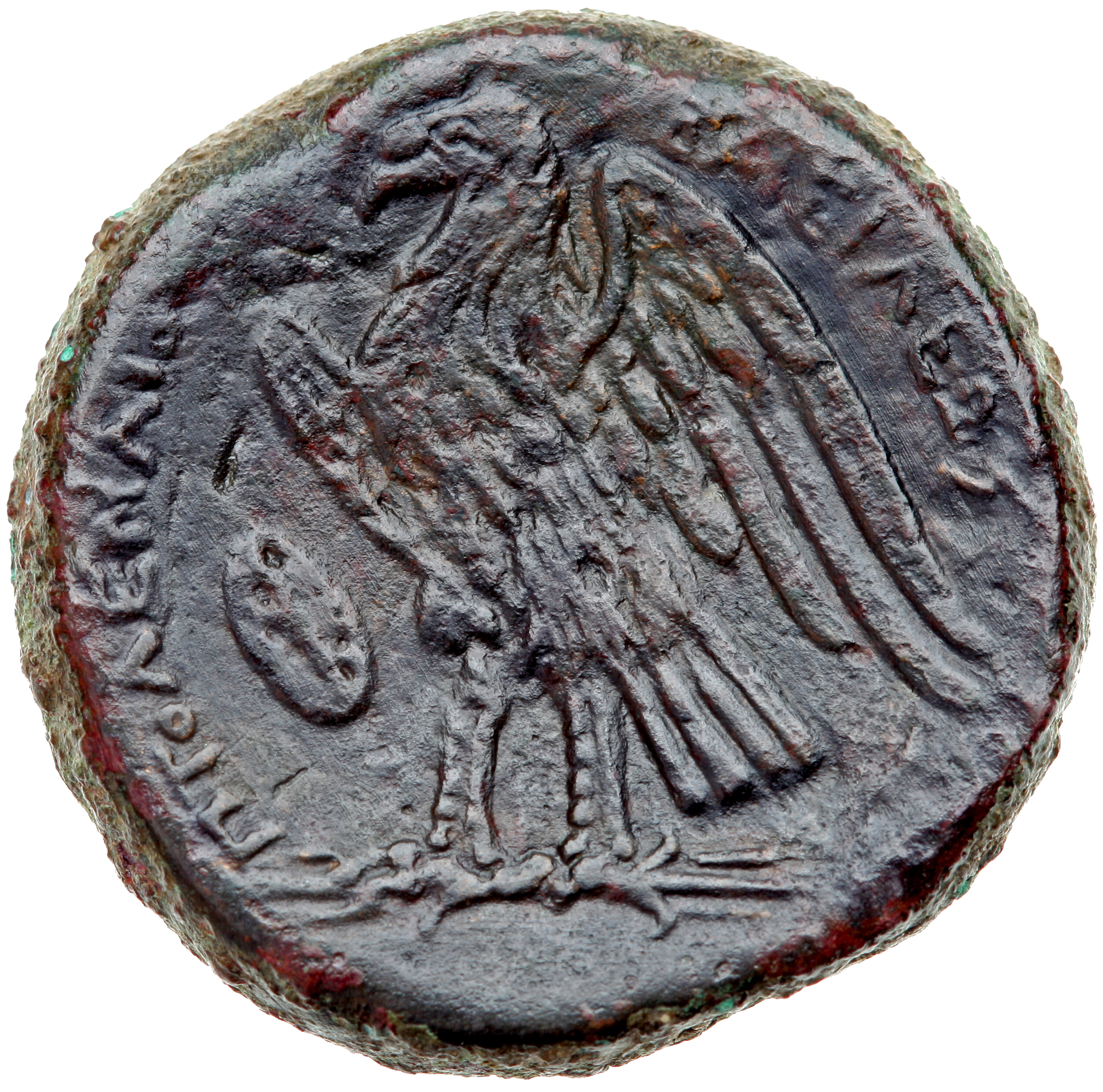 ΠΤΟΛΕΜΑΙΟΥ on l. ΒΑΣΙΛΕΩΣ on r.: Eagle with spread wings standing left on thunderbolt, solid reverse border