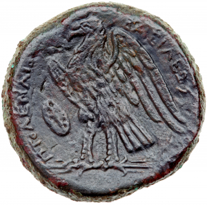 ΠΤΟΛΕΜΑΙΟΥ on l. ΒΑΣΙΛΕΩΣ on r.: Eagle with spread wings standing left on thunderbolt, linear border