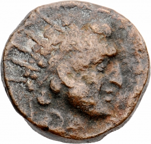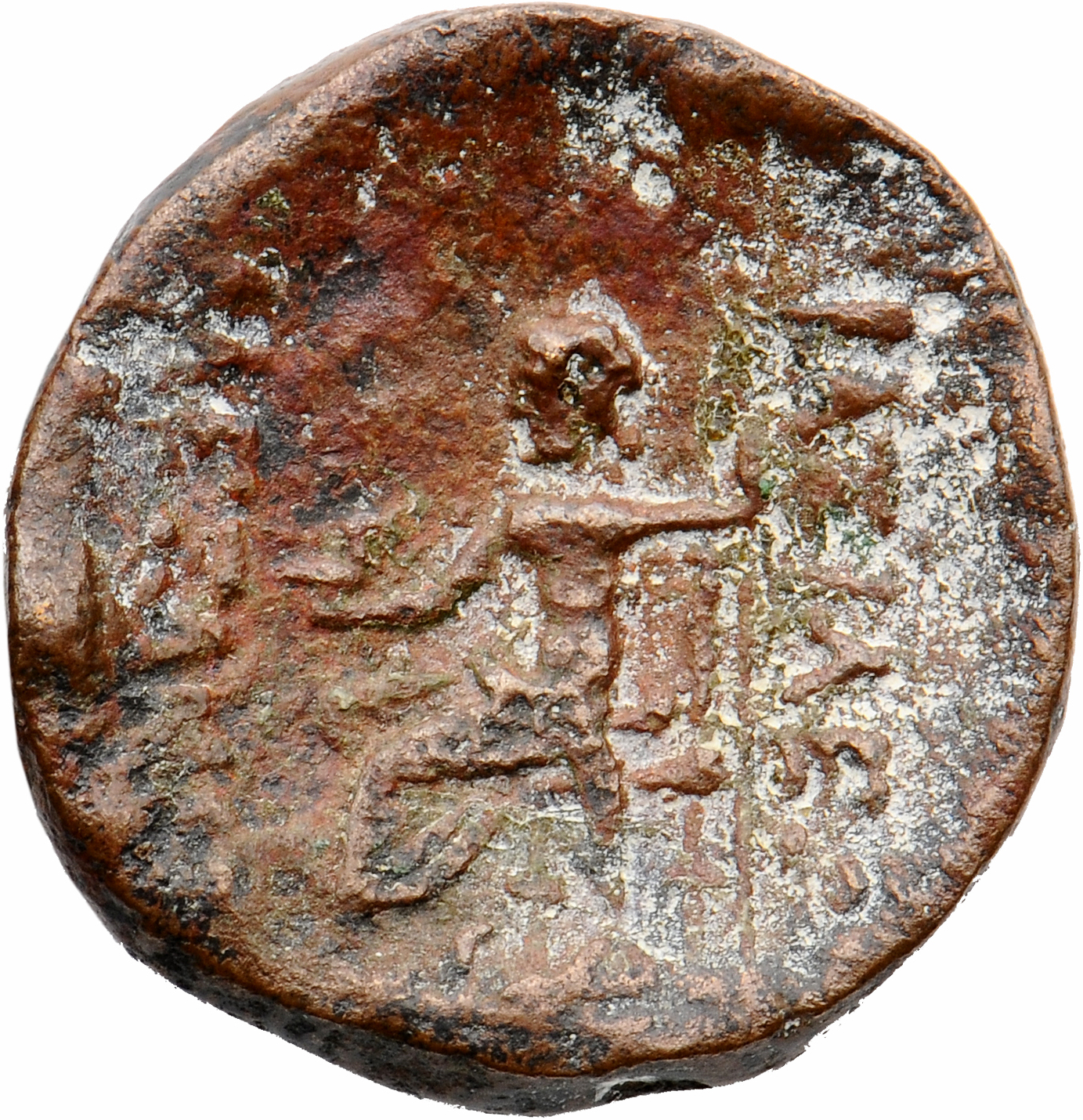 BAΣΙΛΕΩΣ AΛEΞANΔPOY ΘEOY KAI EYEPΓETOY: Zeus seated on high-backed throne left, holding Nike facing right offering wreath on outstretched right hand and sceptre in left